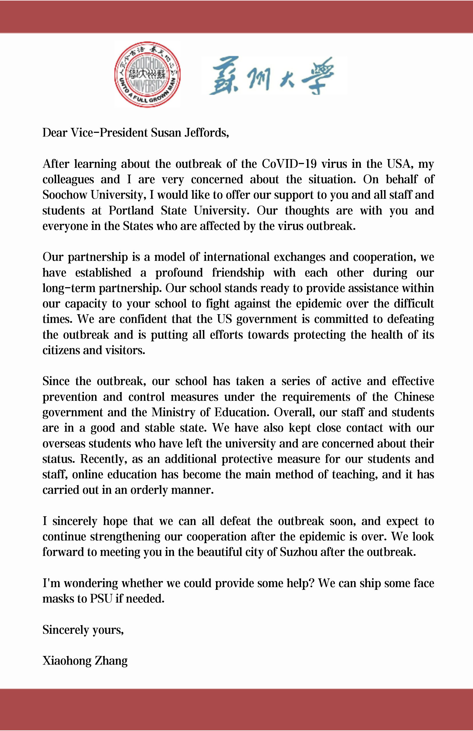 3月初,當美國俄勒岡州因疫情沖擊而宣布進入緊急狀態時,我校黨委常委、副校長張曉宏在第一時間向波特蘭州立大學教務長兼學術事務副校長Susan Jeffords致信問候,表達對波特蘭州立大學全體師生的誠摯慰問,并表示蘇州大學非常愿意助力波州大共渡難關。