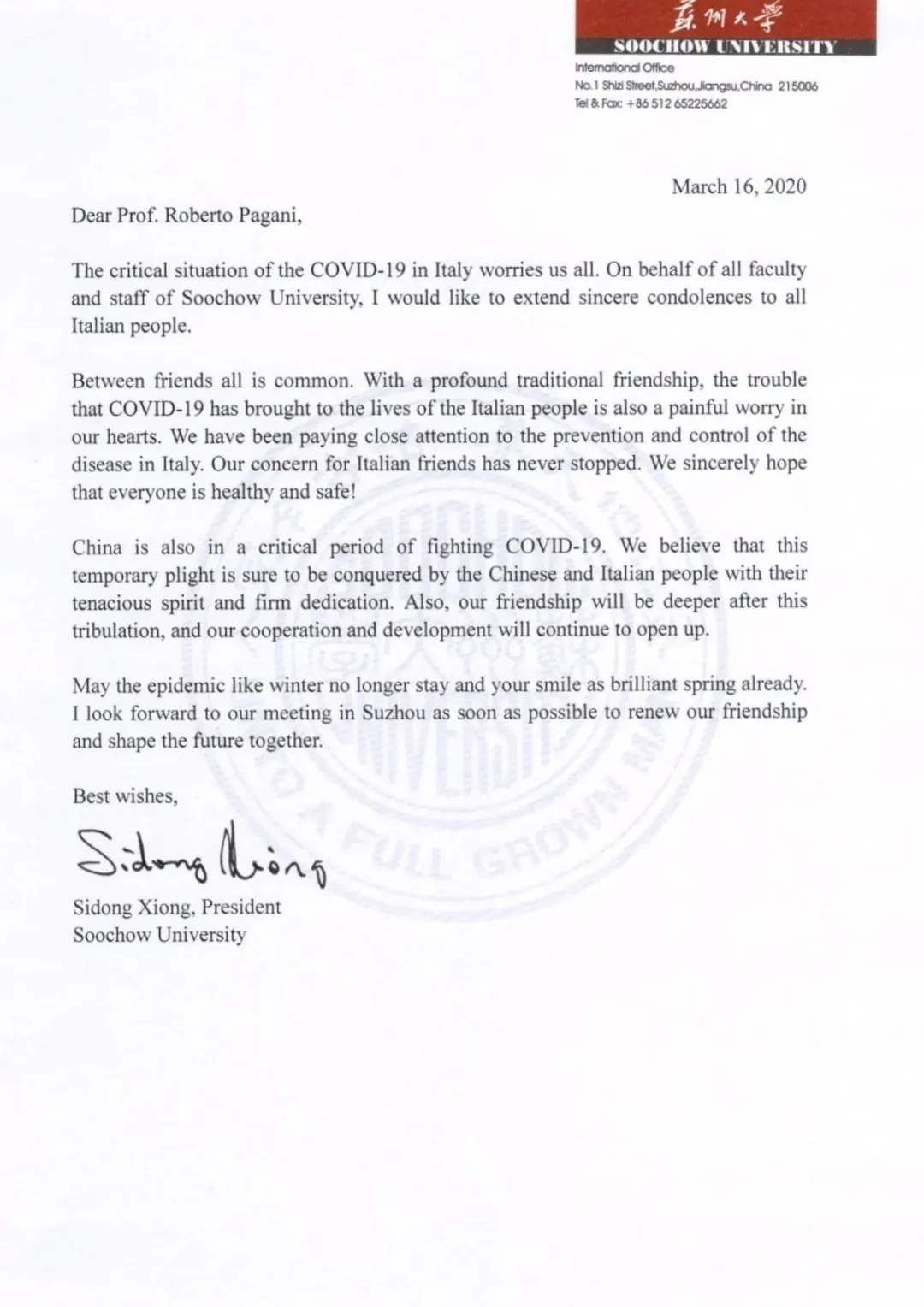 中意友誼源遠流長,根基深厚。國內疫情爆發后,意大利駐滬總領事館在第一時間致信熊思東校長表示慰問。疫情在意大利爆發后,熊思東校長也在第一時間致信問候意大利駐滬總領事館科技參贊Roberto Pagani,信中表示,蘇州大學全體師生深切地牽掛著處于危難時刻的意大利人民,希望意大利朋友們頑強奮戰,早日戰勝疫情!