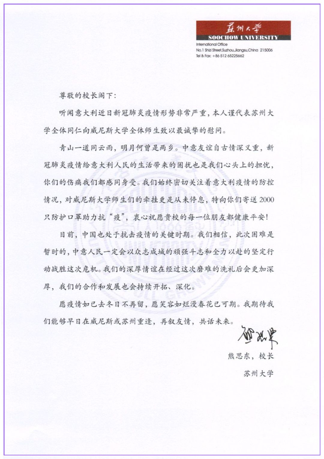 蘇州大學與威尼斯大學在2017年建立了戰略合作伙伴關系。在意大利的疫情爆發以后,我校黨委常委、副校長張曉宏在第一時間向威尼斯大學副校長Tiziana Lippiello發信慰問。在得知威尼斯大學防疫形勢嚴峻,尤其物資緊缺的情況后,我校黨委書記江涌和校長熊思東都萬分掛念。熊思東校長代表我校全體師生向威尼斯大學校長Michele Bugliesi發去誠摯慰問,并表示急難有情,情有馀兮,蘇州大學將提供支持,唯盼師生朋友安康無恙。