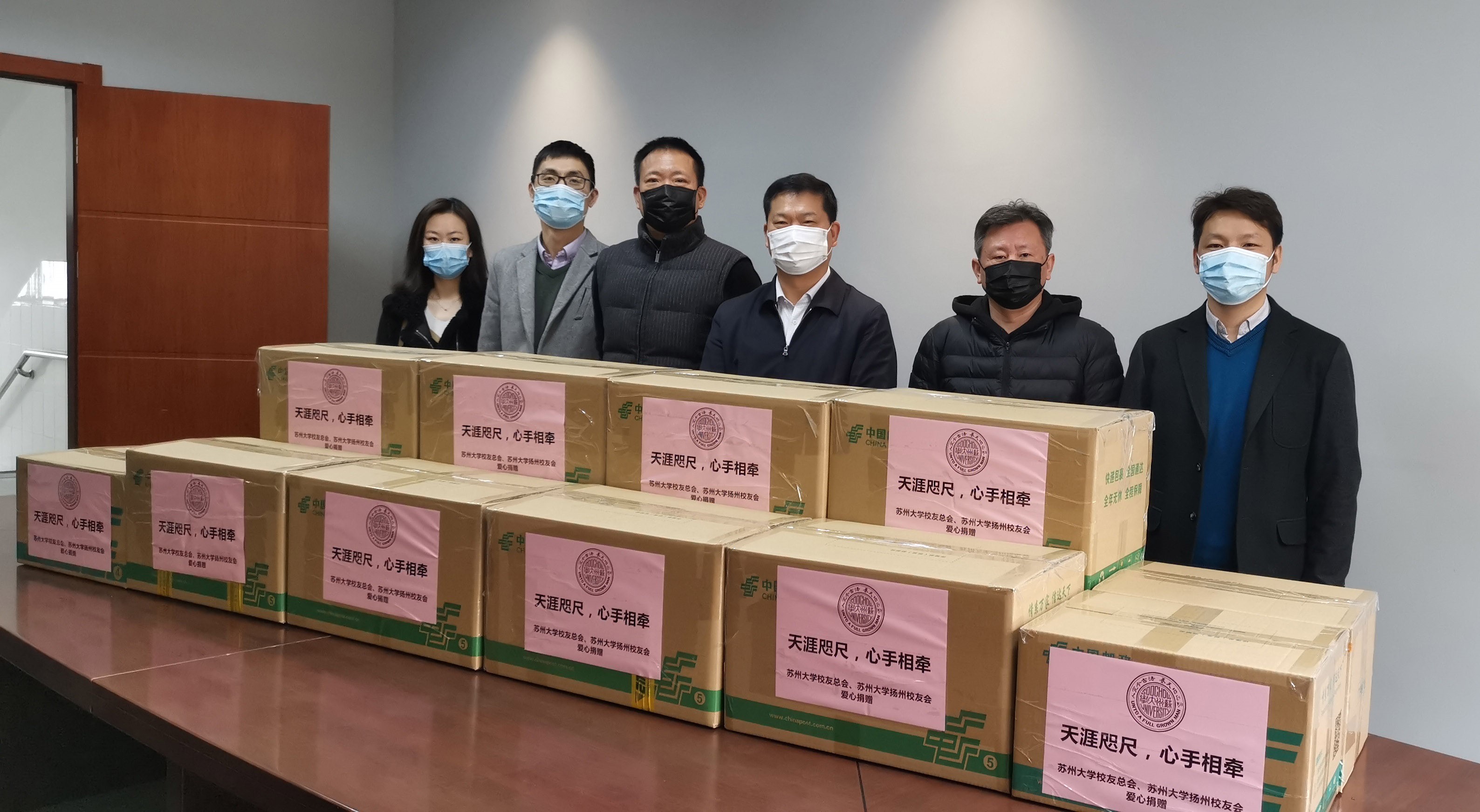 涓滴愛心,匯聚成蘇大愛的海洋,凝聚成強勁的蘇大力量。北美校友會的高國強、郭紅蓮、李慧霖,英國校友會的葉蘭、毛志強等校友紛紛慷慨解囊并大力發動身邊的親朋好友為武漢、為湖北、為母校捐款捐物。北美校友會美國校友周捷醫生為武漢捐贈了一大批醫用物資;北美校友會陳嶺向蘇大附屬第一醫院捐贈了2000只最高防護等級9050型口罩;英國一名不愿透露姓名的校友為母校捐贈了4000只口罩;新西蘭校友會會長王小選帶領新西蘭校友們捐款購買了1250只口罩;校友姜傳超所在的日本恒產株式會社向蘇大捐贈了2000只口罩。同時,更多國(境)外校友也用實際行動踐行“養天地正氣,法古今完人”的校訓精神,大家不辭勞苦、多方聯絡,大力籌措各類防疫物資,用無私大愛和蘇大擔當為祖國、為母校筑起一道戰“疫”必勝的堅固防線。