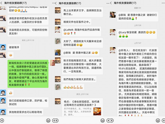 國內各校友組織除了積極響應校友總會發布的愛心動員令之外,還以多種方式熱心支援海外校友。在校友總會組建的“蘇州大學海外校友援助群”內,國內校友們利用自己掌握的豐富的防疫經驗和廣泛的物資采購渠道,在第一時間與海外校友們的防疫需求進行精準對接。比如,組建了“慈善中醫之家”醫療團隊并且親赴武漢抗疫一線的校友戴新瑞,不僅毫無保留地與海外校友們分享自己在抗疫一線取得的成功救助經驗,還積極為大家提供中醫藥采購等支援服務。此外,對于有N95口罩等防護物資需求的海外校友,廣大國內校友也紛紛與之積極對接并提供最大支持。