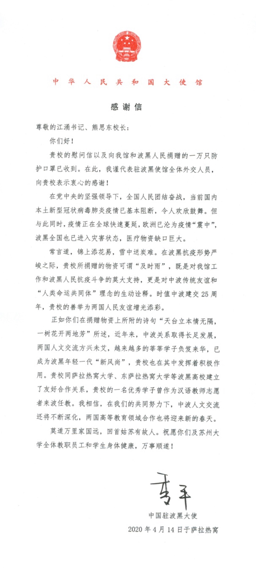 3.中國駐波黑大使館向我校發來感謝信:莫道萬里家國遠,回首姑蘇有故人。