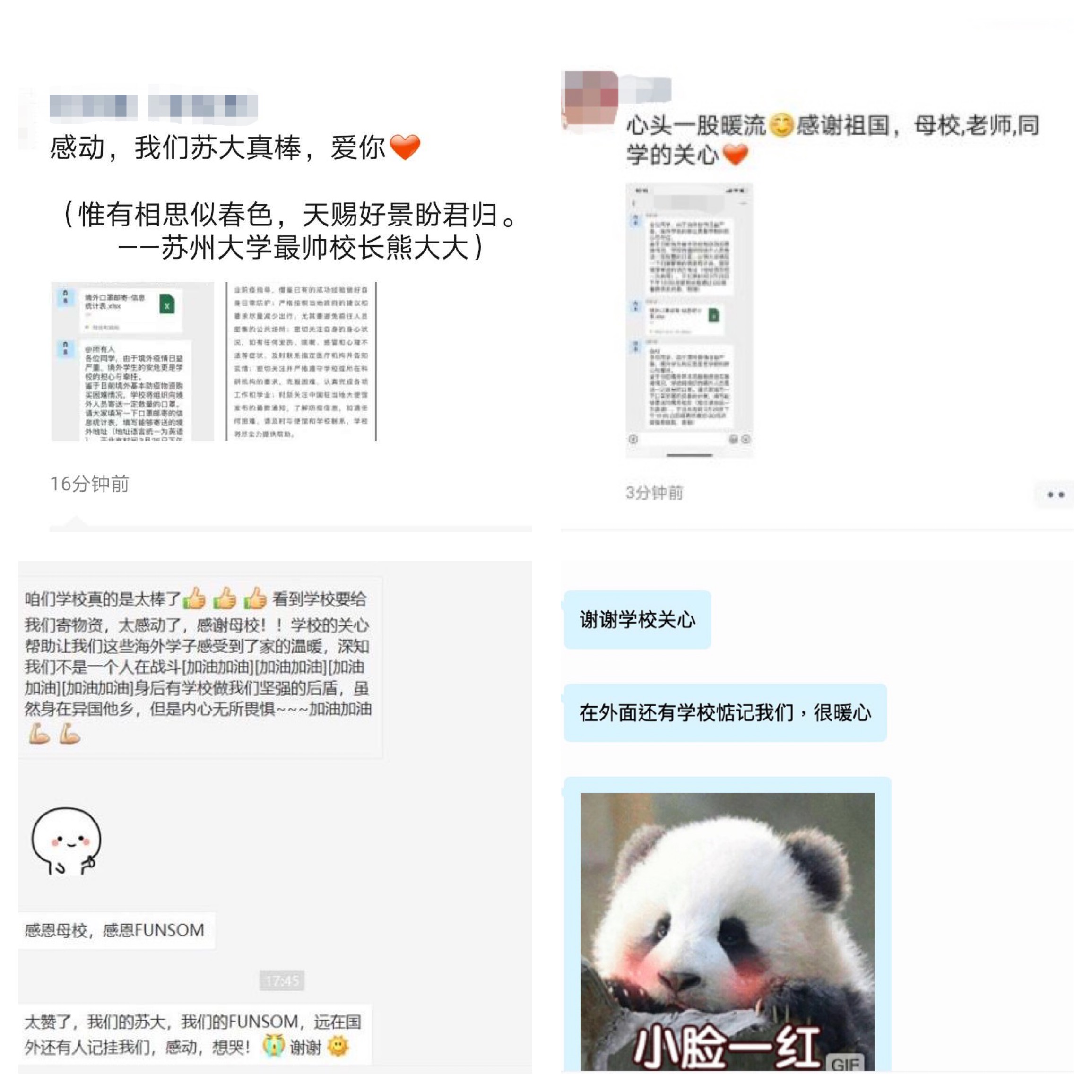 “新冠肺炎疫情牽動著中國人民的心,而身處境外的每一位蘇大人牽動著學校的心。值此疫情肆虐的特殊時期,蘇大向身處境外的你們致以最誠摯的問候!”“惟有相思似春色,東吳好景盼君歸。無論你們身處何方,學校永遠是大家最堅強的后盾。”