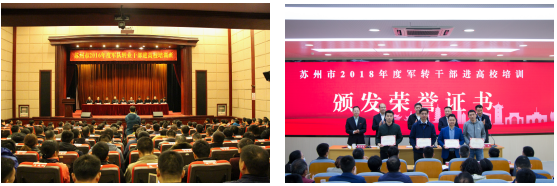 2017年5月,蘇州市頒布了《關于進一步探索開展軍隊轉業干部進高校專項培訓的通知》,充分依托屬地高校蘇州大學優質教學資源,我校率先開展轉業軍官進高校培訓,成為試點單位。同年在我校設立“江蘇省軍隊轉業干部進高校專項培訓基地”。校地雙方成立了軍轉干部教育培訓工作領導小組,在分析整合學員需求、組織需求、崗位需求和協商研討的基礎上,校地雙方制訂了《蘇州市軍轉干部教育培訓的總體規劃和專項培訓的實施方案》,凝練出“以軍轉干部為本,讓軍轉干部受益,助力軍轉干部華麗轉身”的培訓理念和共識。從此,拉開了蘇州大學軍隊轉業干部進高校專項培訓的序幕。