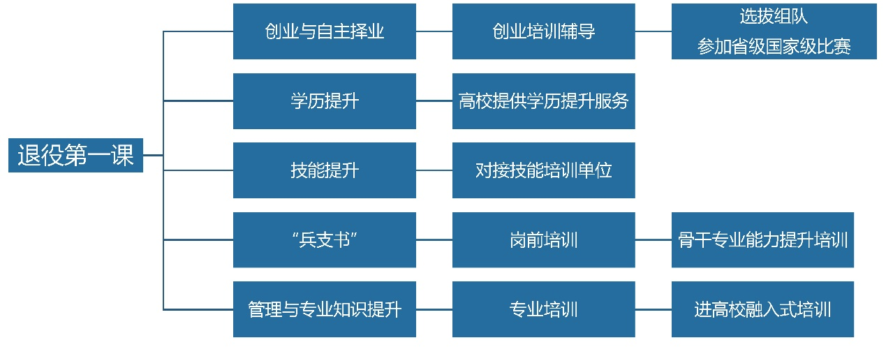 蘇州大學退役軍人教育培訓學院積極對接省市退役軍人事務局,以“為退役軍人,堅決當好退役軍人中轉站”為服務宗旨,提供相應的培訓。按照“整合資源、提高效率、規范管理、注重質量”的原則,依托江蘇省軍轉干部進高校專項培訓基地提出新構想,建設軍轉干部教育、退役軍人事務系統教育、退役士兵(士官)教育三大中心,分為“兩個階段、五大模塊、八種形式”:在成長階段上,分安置前和安置后兩個階段。其中安置前培訓以“聚焦政策解讀、強化適應能力、理性選崗擇崗”為主,安置后培訓以“突出個性需求、促進人崗相適、加快轉型發展”為主。打造“退役第一課”“學歷教育+職業教育”“技能培訓+定向培訓”“能力素質提升+就業創業幫扶”相互融合貫通的學習體系,完善線上平臺服務,以現場教學為載體,建立“線上+線下”相結合的培訓體系,實現“理論+實踐”相結合。