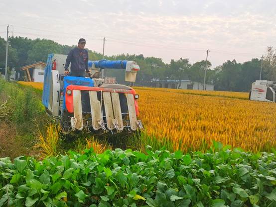 收割機的聲音在旁邊傳來,剛割好的稻谷頃刻間變成了車斗里嘩嘩作響的谷粒,大家為豐收的景象感到快樂,贊嘆科技的進步給人類生活生產帶來的便利。