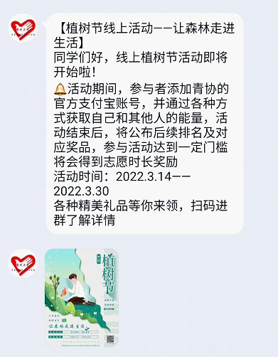 萬物復蘇季,春植正當時為豐富同學們戰“疫”期間的居家生活,引領師生堅定不移走“生態優先、綠色發展”之路,在第44個植樹節來臨之際,計算機科學與技術學院青年志愿者協會開展主題為“擁抱綠色,讓森林走進生活”線上植樹活動,讓同學們“宅家”也能播種綠色,擁抱春天。此次線上植樹活動吸引各年級同學踴躍參與,共計百余人次參加線上植樹澆水等活動。