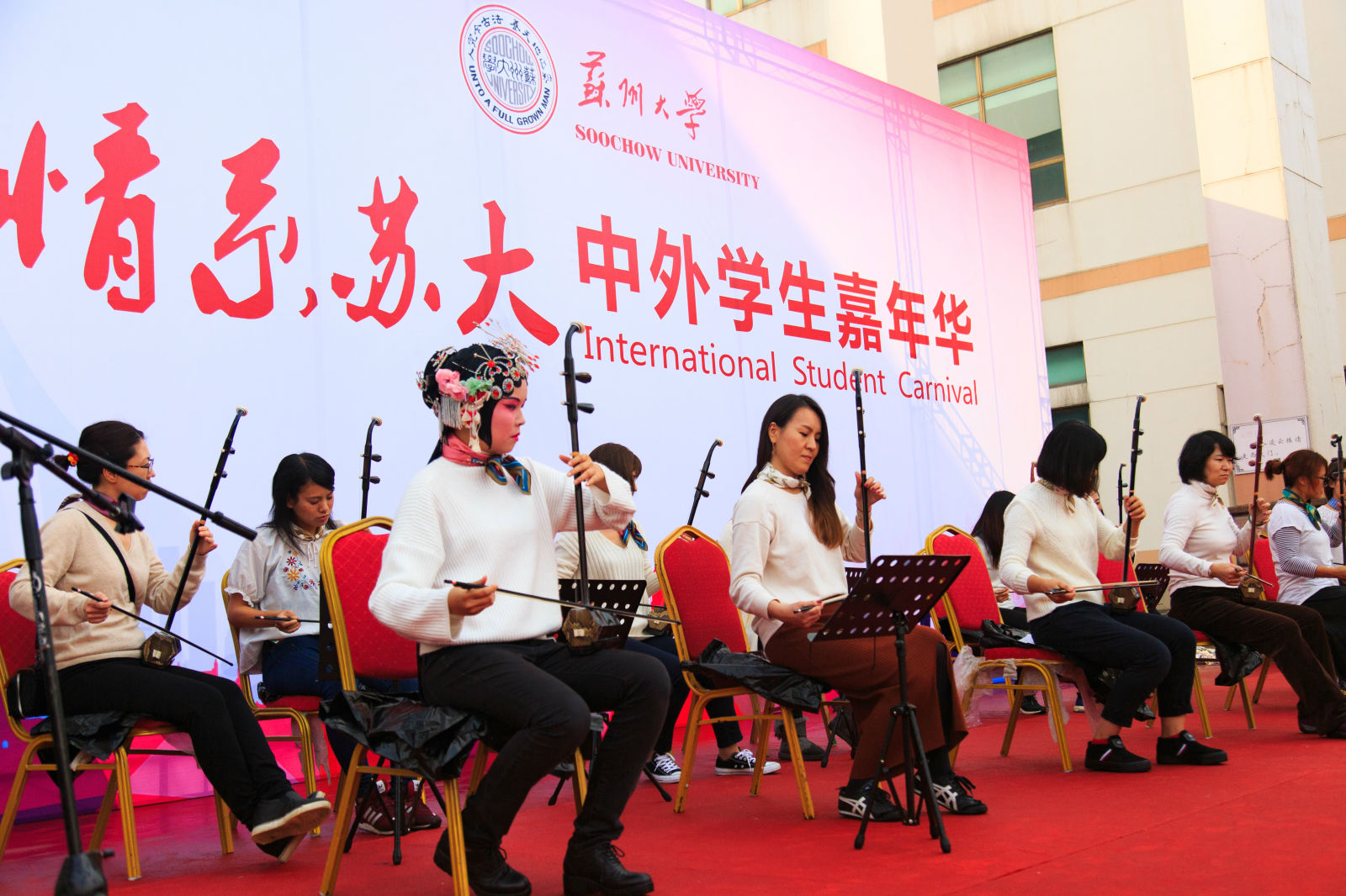 1118日下午,由我校海外教育學院主辦,校內多個學院和職能部門以及鐘樓社區、蘇州工藝美院等多家校外友好單位共同參與協辦的“情系蘇大”中外學生嘉年華活動在東校區舉行。來自40個國家的數百位蘇大留學生與中國學生齊聚現場,帶來了地道的異國美食和精彩的文藝表演。