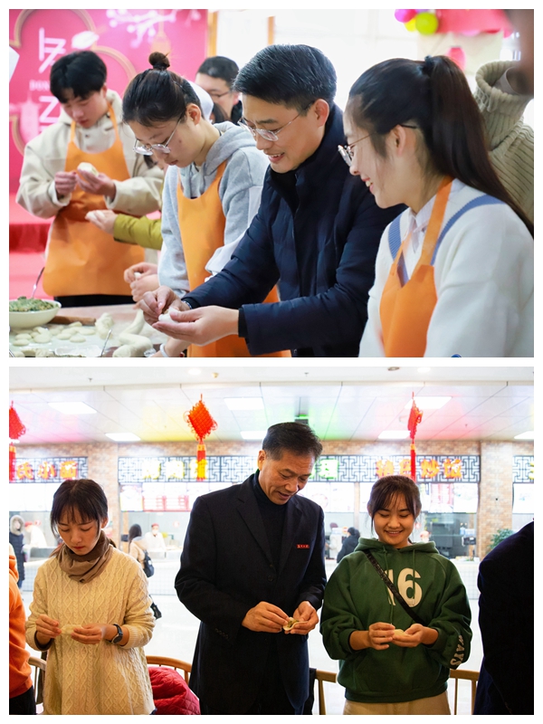 師生齊聚,喜迎冬至。校黨委副書記鄧敏、副校長楊一心分別來到天賜莊校區和獨墅湖校區學生餐廳,與同學們一起包餃子、吃團圓飯,暢談學習生活,分享人生經驗,其樂融融!同學們還向保安大叔和宿管阿姨送上了自己親手包的餃子和寫滿暖心話語的明信片,以感謝他們的辛勤付出與守護。“太感謝同學們了,天氣這么冷還麻煩你們送餃子過來,心里暖暖的!”保安大叔們端起手中餃子難掩激動的心情。