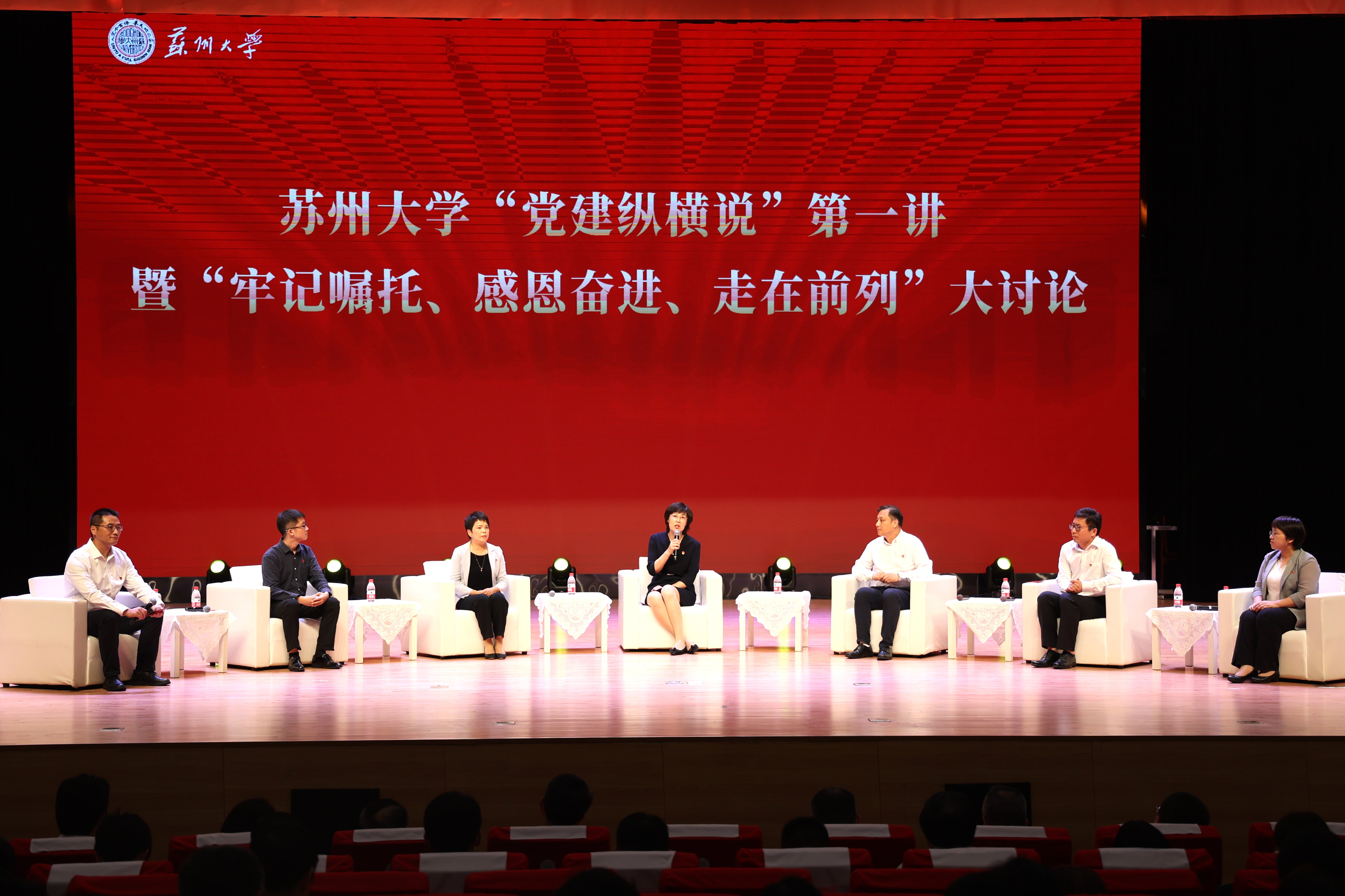 隨后,在蘇州大學(xué)“黨建縱橫說”第一講中,黨委組織部副部長程曉軍主持并邀請6位不同身份的師生黨員代表共坐一堂,緊緊圍繞“牢記囑托、感恩奮進(jìn)、走在前列”這一主題,展開了一場熱烈生動(dòng)的發(fā)展大討論,從不同視角作了精彩分享。
