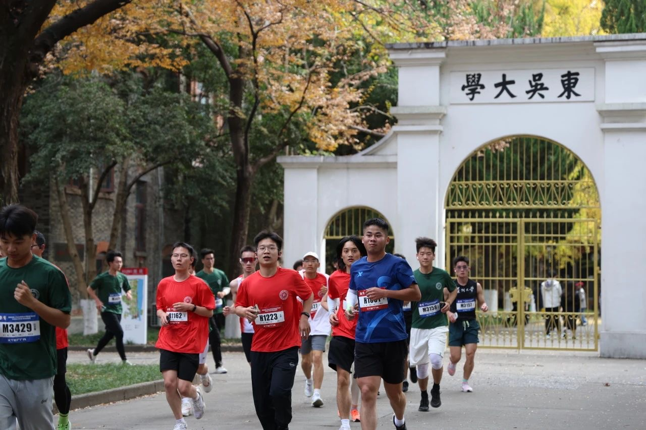 一半賽道,一半風景。今年的蘇大校園馬拉松賽道依舊延續了人文氣息與校園風光并重的路線,參賽選手從鐘樓出發途經維正堂、東吳路、存菊堂、文星東路、文星閣、蘇大幼兒園、鴻遠樓、光學樓、維格堂、博物館等蘇大校園標志性建筑,在奔跑中近距離體驗校園深秋美景,體會“養天地正氣,法古今完人”的文化內涵。