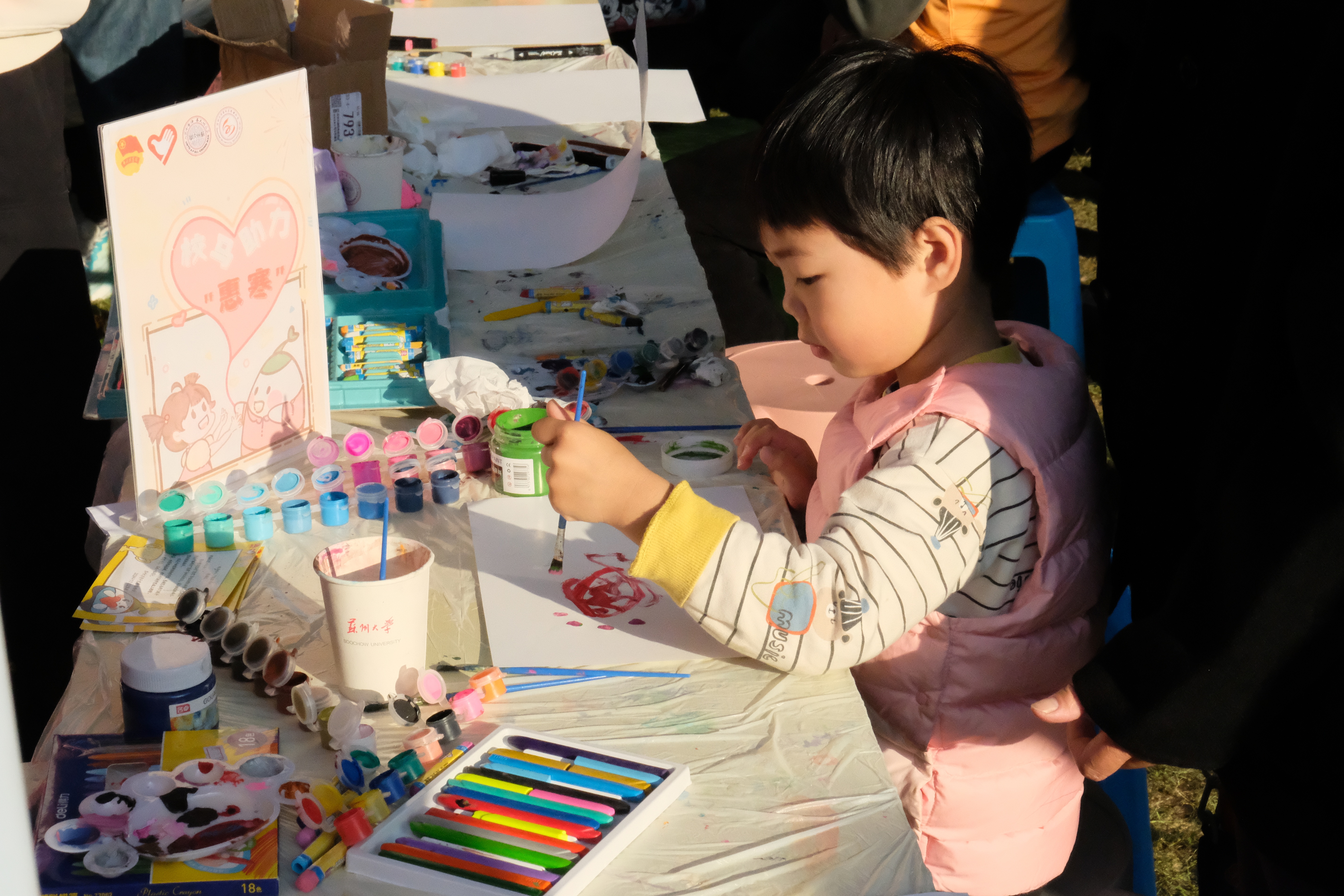 值得一提的是,本次校園馬拉松設有“惠寒”活動專區,旨在弘揚蘇大百年“惠寒”志愿服務精神,讓更多人認識“惠寒”,了解“惠寒”,并為“惠寒”志愿服務品牌建設添磚加瓦。粘土鑰匙扣、帆布袋彩繪、投壺、兩人三足,歡樂的活動現場拉近了大家的距離。
